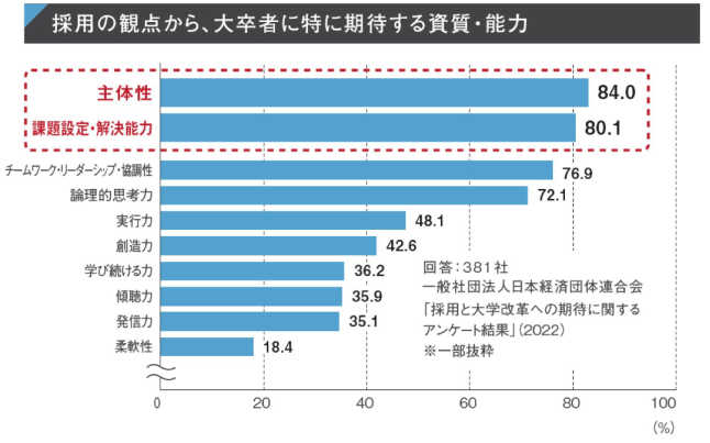 - 卒業生採用実績のある企業、保育所・幼稚園・福祉施設のアンケート結果から、本学の「強み」となっているスキルは「親和力」と「協働力」「行動持続力」でした。いずれも現場において特に必要とされるスキルです。社会で活躍する人の多くは、決して一人で仕事をするのではなく、周囲を助け、また周囲の助けを得ながら大きな成果を上げています。 同僚や取引先企業と円満な人間関係を築き、仲間と協力的に仕事を進める能力は不可欠でしょう。また、様々な困難に負けずに自分から良い行動をし続ける習慣も社会人に欠かせないスキル。本学の卒業生は、こうした現場で必要とされる力が身についていると評価されています。